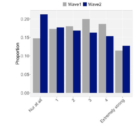 Figure 1. Comparaison du niveau de stress entre le 1er et le 2e volet (wave) de l’étude. Proportion = proportion de participants dans une catégorie en fonction du nombre total de participants dans le volet.