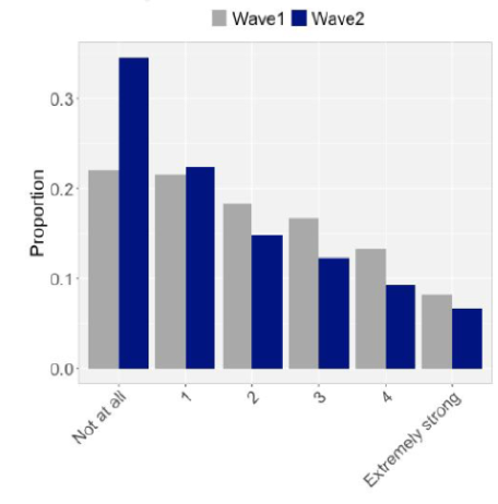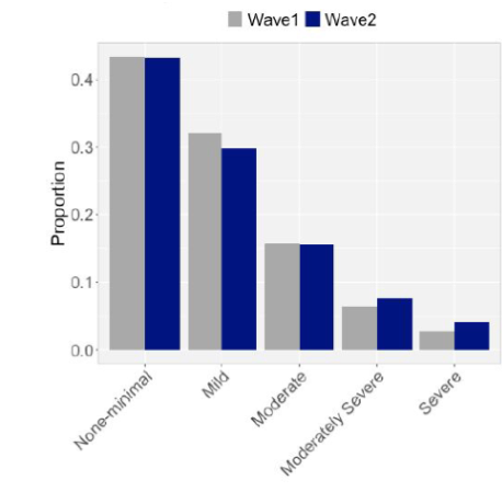 Figure 2. Comparaison des symptômes dépressifs entre le 1er et le 2e volet (wave) de l’étude. Proportion = proportion de participants dans une catégorie en fonction du nombre total de participants dans le volet.