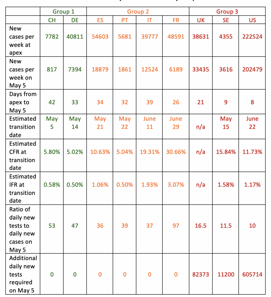 This article shows that Switzerland and Germany are ready to dance. Spain, Portugal, Italy, and France still need to prolong their lockdowns a bit further but already have adequate testing capabilities. Finally, the UK, Sweden, and the US should prolong their lockdowns for longer so that they bring down the number of daily new cases and develop adequate testing capabilities.