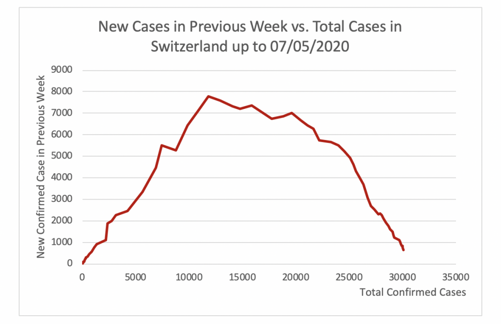 Figure 1 displays the evolution of total confirmed cases (horizontal axis) and new confirmed cases in the previous week (vertical axis) in Switzerland since the 100th confirmed case. It shows that the apex of the epidemic in Switzerland was reached at 7782 cases per week. This took place on March 26. Since then the number of new cases per week has steadily decreased to 817 on May 5.