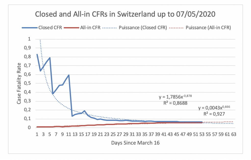 We see from Figure 2 that the Closed CFR and the All-in CFR in Switzerland are very close to each other. In fact, their values are 6.34% and 5.83%, respectively. The blue dotted curve depicts a power trend that fits the evolution of the Closed CFR and the red dotted line depicts a power trend that fits the evolution of the All-in CFR.  When the two trends intercept the closed CFR and the all-in CFR are identical. This happens when the CFR is 5.8%.