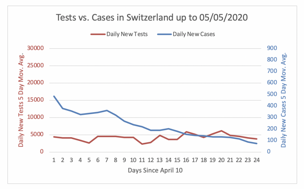 Figure 3 displays the evolution of the daily new tests and daily new cases in Switzerland using a 5 day moving average and starting on April 10. The vertical axis on the left (in red) depicts the daily new tests. The vertical axis on the right (in blue) depicts the daily new cases. The two vertical axes are scaled so that they are comparable. According to Puyeo (2020b): “the experience of countries that controlled the epidemic indicates we should aim for at least 3% of positives, which means you want approximately 33 times more tests than cases.” Following this approach, the vertical axis on the left (tests) is 33 times bigger than the vertical axis on the right (cases). Hence, when the blue line is above the red, not enough tests are being done. In contrast, when the red line is above the blue line, then enough tests are being done. Figure 3 shows that the number of daily new tests in Switzerland has been at around 5000 tests per day during the last 24 days. In contrast, the number of daily new cases has steadily decreased in the past 24 days from more than 500 to less than 100. The number of daily new tests is now 53 times the number of daily new cases. Hence, Switzerland is doing enough testing.