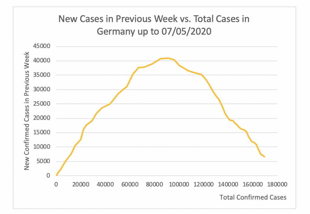 Figure 4 shows that the apex of the epidemic in Germany was attained at 40811 cases per week. This took place on April 3. Since then this number has steadily decreased to 7394 on May 5.
