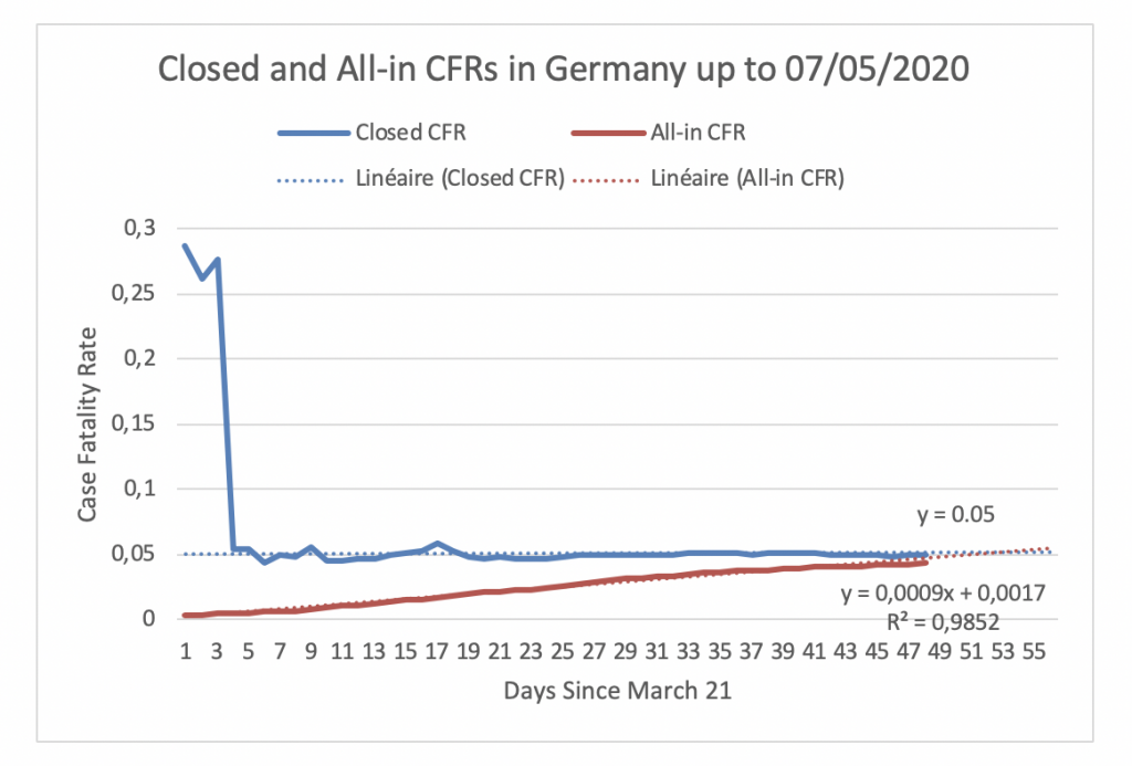 Figure 5 displays the evolution of the Closed CFR and the All-in CFR in Germany since March 21, the day the Closed CFR in Germany attained its maximum. Figure 5 shows that the Closed CFR and All-in CFR are very close. In fact, their values are 5.02% and 4.36%, respectively. If the two CFRs follow their fitted trends, they will intercept at 5.02% on May 14.