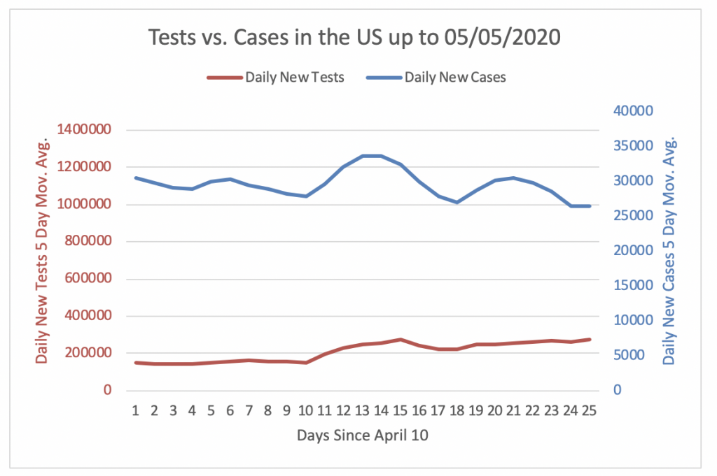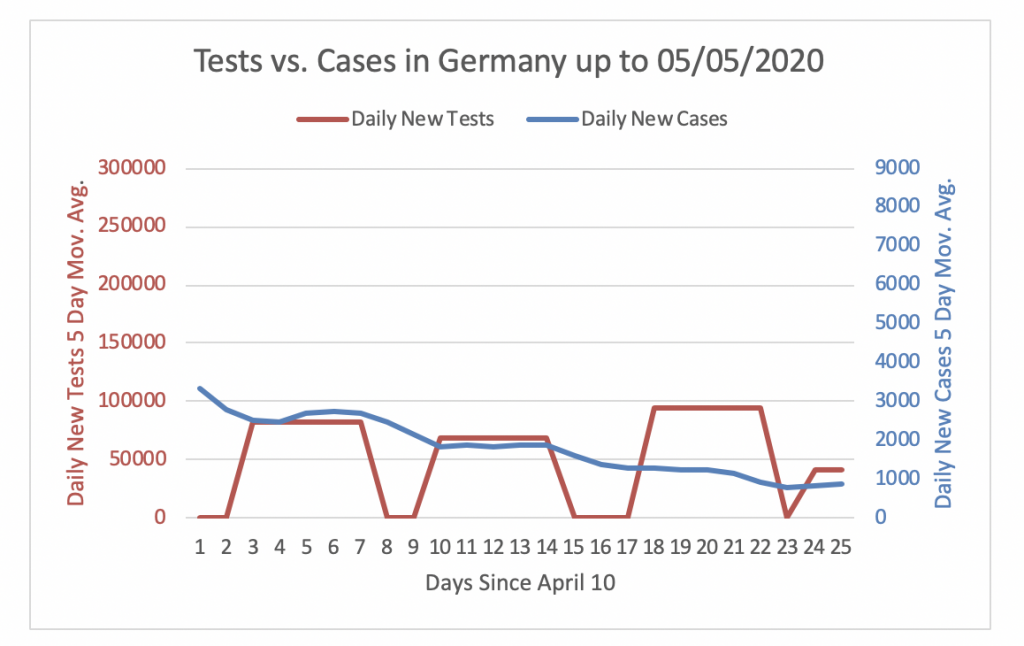 Figure 6 shows that Germany was not performing enough tests to detect cases until April 24. However, since then the daily new tests are adequate to detect cases. The number of daily new tests has been at around 75000 tests per day during the last 24 days. Since the number of daily new cases decreased steadily in the past 24 days, daily new tests are now 47 times higher than daily new cases.