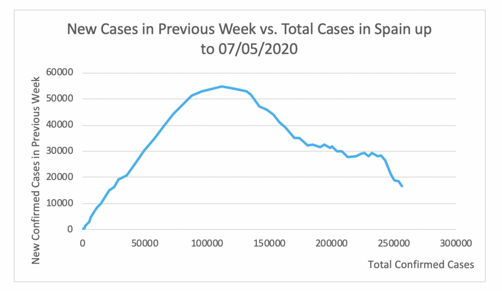 Figure 13 shows that the apex of the epidemic in Spain was attained at 54603 cases per week. This took place on April 2. Since then this number has steadily decreased to 18879 on May 5.