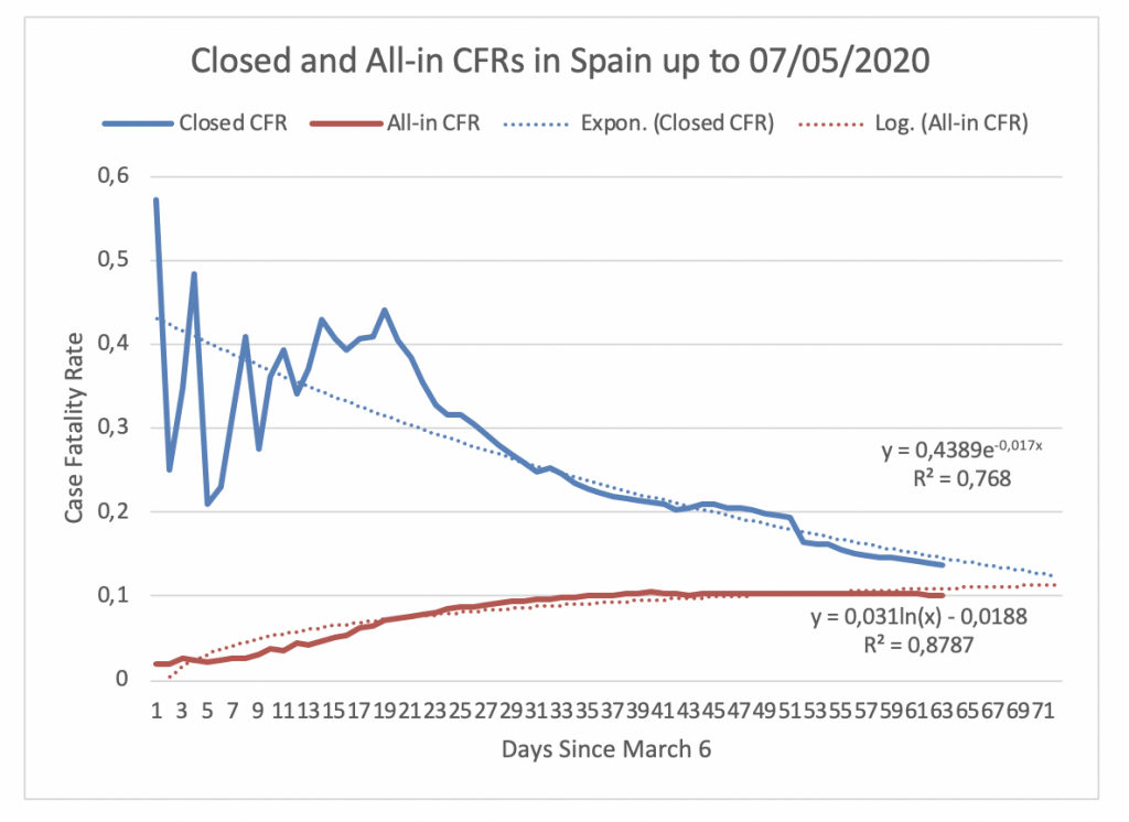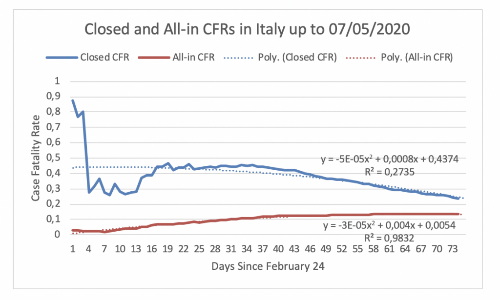 Figure 8 displays the evolution of the Closed CFR and the All-in CFR in Italy since February 24, the day the Closed CFR in Italy attained its maximum. Figure 8 shows that the Closed CFR and All-in CFR have not yet converged. On May 7, the Closed CFR is 24% and the All-in CFR is 14%. Hence, the gap between the CFRs in Italy is 10%. If the CFRs follow their respective fitted trends, they will intercept at 19.31% on June 11.