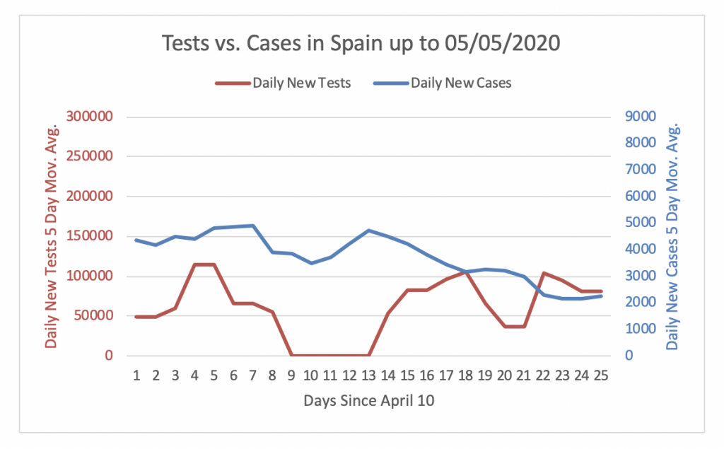 Figure 15 shows that Spain was not performing enough tests to detect cases until the 28th of April. However, in the last few days the daily new tests are adequate to detect cases. The number of daily new tests performed in Spain has been at around 50000 tests per day during the last 24 days. Since the number of daily new cases has been steadily decreasing in the past 24 days, the number of daily new tests is now about 36 times the number of daily new cases.