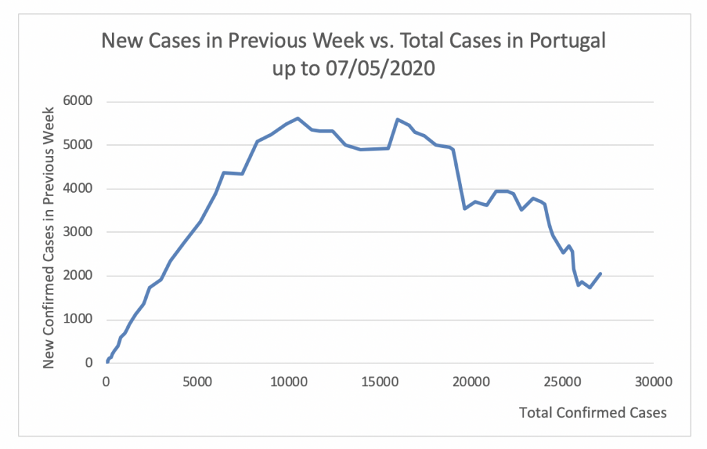 Figure 16 shows that the apex of the epidemic in Portugal was attained at 5681 cases per week. This took place on April 4. Since then this number has steadily decreased to 1861 on May 5.