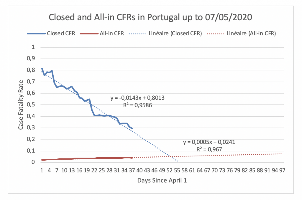 Figure 17 displays the evolution of the Closed CFR and the All-in CFR in Portugal since April 1, the day the Closed CFR in Portugal attained its maximum. On May 7, the Closed CFR is 30% and the All-in CFR is 4%. Hence, the gap between the CFRs in Portugal is 26%. If the CFRs follow their respectively fitted trends, they will meet at 5.04% on May 22.