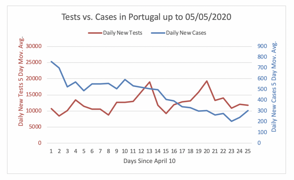 Figure 18 shows that Portugal was not performing enough tests to detect cases until April 22. However, since then the daily new tests are, on average, adequate to detect cases. The number of daily new tests performed in Portugal has been at around 12500 tests per day during the last 24 days. Since the number of daily new cases has steadily decreased in the past 24 days, the number of daily new tests is now 39 times the number of daily new cases.