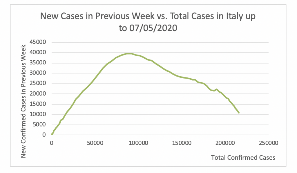 Figure 7 shows that the apex of the epidemic in Italy was attained at 39777 cases per week. This took place on March 28. Since then this number has steadily decreased to 12524 on May 5. This number of cases per week is still relatively high. It is not easy to perform testing, contact tracing, and isolation with 12524 new cases per week.