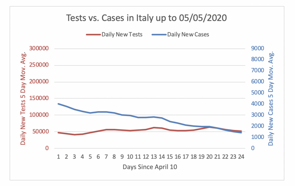 Figure 9 shows that Italy was not performing enough tests to detect cases until the 30th of April. However, in the last few days the daily new tests are adequate to detect cases. The number of daily new tests performed in Italy has been at around 50000 tests per day during the last 24 days. Since the number of daily new cases has been steadily decreasing in the past 24 days, the number of daily new tests is now 37 times the number of daily new cases. Hence, Italy is doing enough testing.