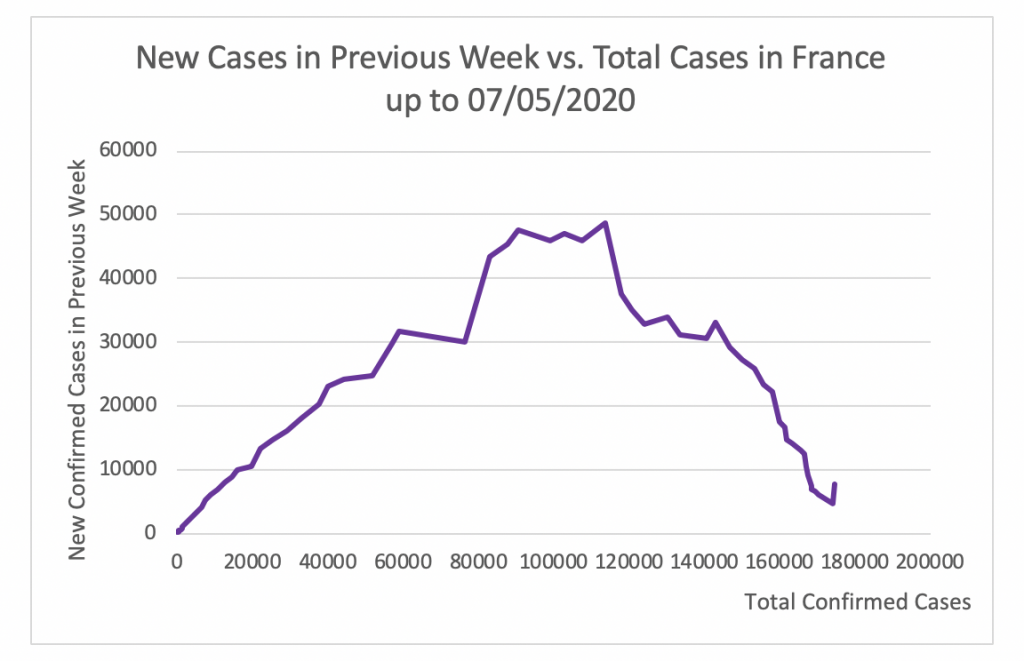 Figure 10 shows that the apex of the epidemic in France was attained at 48591 cases per week. This took place on April 11. Since then this number has steadily decreased to 6189 on May 5.