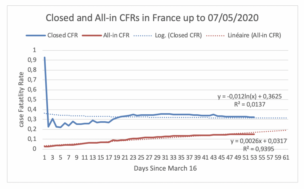 Figure 11 displays the evolution of the Closed CFR and the All-in CFR in France since March 16, the day the Closed CFR in France attained its maximum. Figure 11 shows that the Closed CFR and All-in CFR have not yet converged. On May 7, the Closed CFR is 32% and the All-in CFR is 14%. If the two CFRs follow their respectively fitted trends, they will meet at 30.36% on June 29.