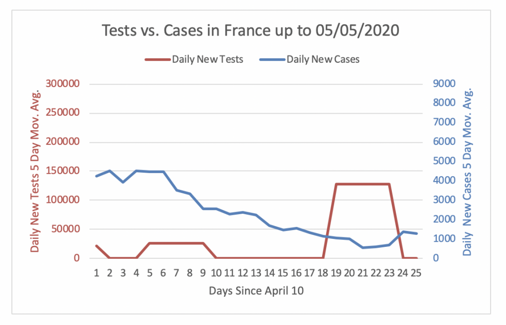 Figure 6 shows that France was not performing enough tests to detect cases until April 28. However, since then the daily new tests are, on average, adequate to detect cases. The number of daily new tests performed in France has oscillated been 0 and close to 12750 tests per day during the last 24 days. Since the number of daily new cases has steadily decreased in the past 24 days, the number of daily new tests is in the last week, on average, 97 times the number of daily new cases.