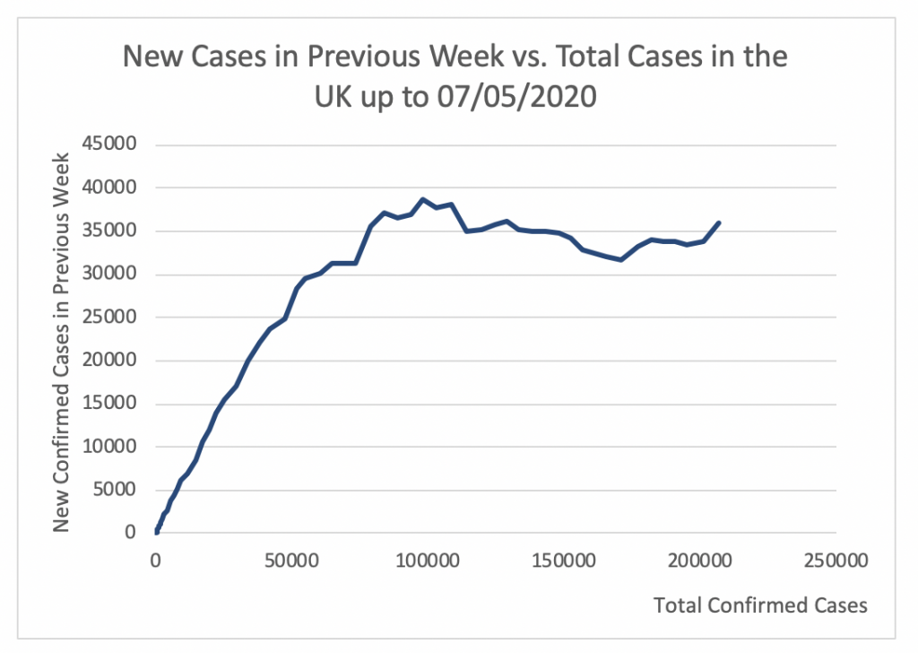 Figure 19 shows that the apex of the epidemic in the UK was attained at 38631 cases per week. This took place on April 15. Since then this number has slightly decreased to 33435 on May 5. This number of cases per week is very high. It is not possible to perform testing, contact tracing, and isolation with 33435 new cases per week.