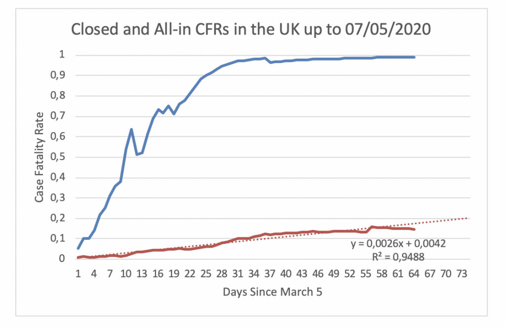 Figure 20 displays the evolution of the Closed CFR and the All-in CFR in the UK since March 5. The dataset used in this article does not contain the number of recovered cases in the UK hence the evolution of the Closed CFR is monotonically increasing. On May 7, the All-in CFR is 15%.