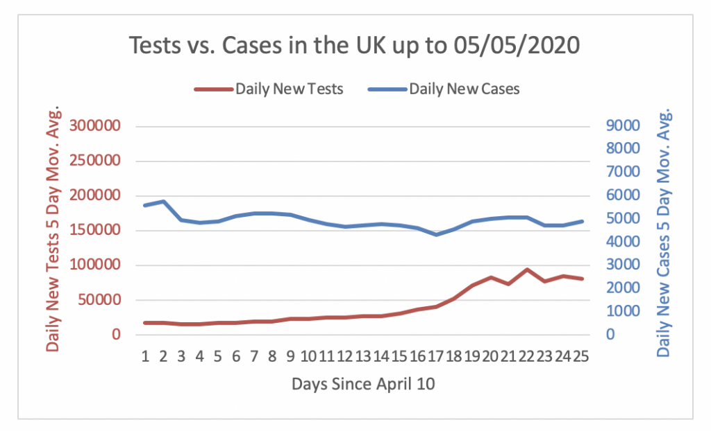 Figure 21 shows that the UK is not performing enough tests to detect cases. On May 5, the number of daily new tests is only about 16.5 times the number of daily new cases. With about 4891 cases on May 5 the UK would need to perform 163300 tests to reach a 3% share of positive tests. However, the UK only performed 80927 tests on May 5. Hence, the gap in testing is 82373 = 163300  – 80927.