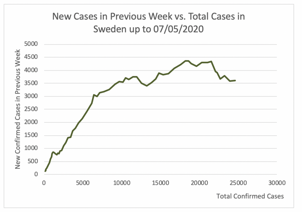 Figure 22 shows that the apex of the epidemic in Sweden was attained at 4355 cases per week. This took place on April 26. Since then this number has decreased to 3616 on May 5.