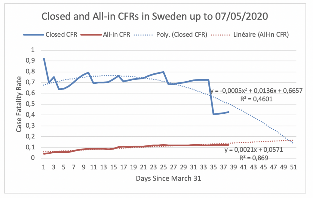 Figure 23 displays the evolution of the Closed CFR and the All-in CFR in Sweden since March 31, the day the Closed CFR in Sweden attained its maximum. Figure 23 shows that the Closed CFR and All-in CFR have not yet converged. On May 7, the Closed CFR is 43% and the All-in CFR is 12%. Hence, the gap between the CFRs in Sweden is 31%. If the CFRs follow their respectively fitted trends, they will meet at 15.84% on May 15.