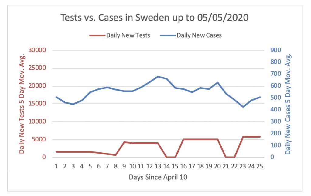 Figure 24 shows that Sweden is not performing enough tests to detect cases. On May 5, the number of daily new tests is only about 11.5 times the number of daily new cases. With about 508 cases on May 5 Sweden would need to perform about 17000 tests to reach a 3% share of positive tests. However, Sweden only performed 5800 tests on May 5. Hence, the gap in testing is 11200 = 17000 – 5800.