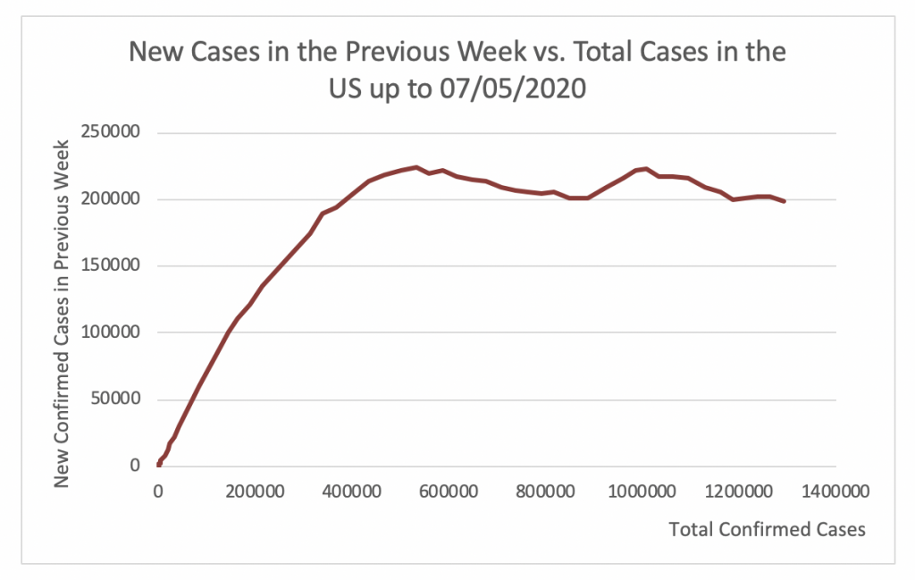 Figure 25 shows that the apex of the epidemic in the US was attained at 222524 cases per week. This took place on April 28. Since then this number has slightly decreased to 202479 on May 5. This number of cases per week is very high. It is not possible to perform testing, contact tracing, and isolation with 202479 new cases per week.