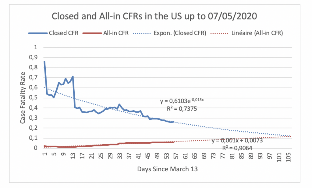 Figure 26 displays the evolution of the Closed CFR and the All-in CFR in the US since March 13, the day the Closed CFR in the US attained its maximum. Figure 26 shows that the Closed CFR and the All-in CFR have not yet converged. On May 7, the Closed CFR is 26% and the All-in CFR is 6%. Hence, the gap between the CFRs in the US is 20%. If the CFRs follow their respective fitted trends, they will meet at 11.73% on June 22.